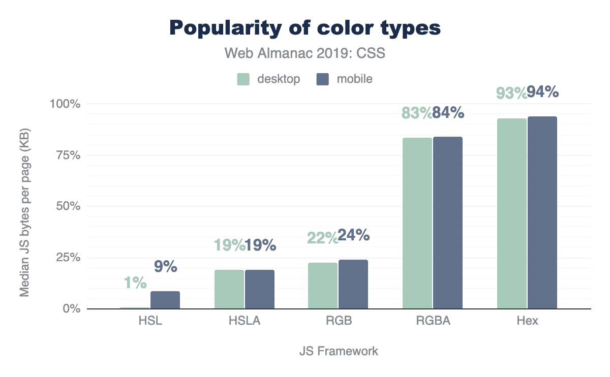 Hex is the most popular way to describe color by far, with 93% usage, followed by RGB, and then HSL. Interestingly, developers are taking full advantage of the alpha-transparency argument when it comes to these color types: HSLA and RGBA are far more popular than HSL and RGB, with almost double the usage! Even though the alpha-transparency was added later to the web spec, HSLA and RGBA are supported as far back as IE9, so you can go ahead and use them, too!