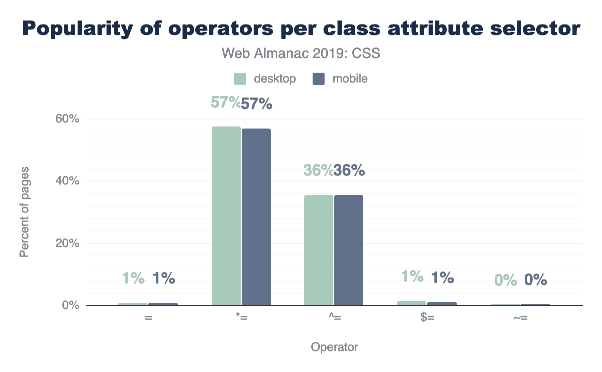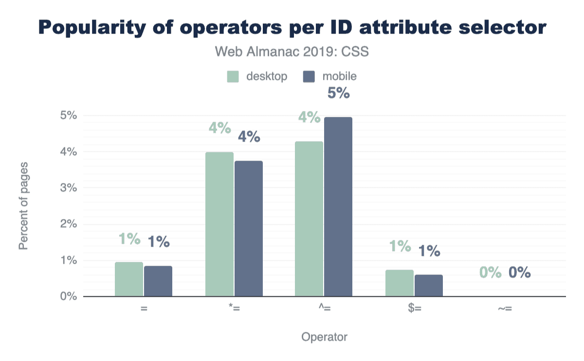 CSS has some very powerful comparison selectors. These are selectors like [target="_blank"], [attribute^="value"], [title~="rad"], [attribute$="-rad"] or [attribute*="value"]. Do you use them? Think they’re used a lot? Let’s compare how those are used with IDs and classes across the web.