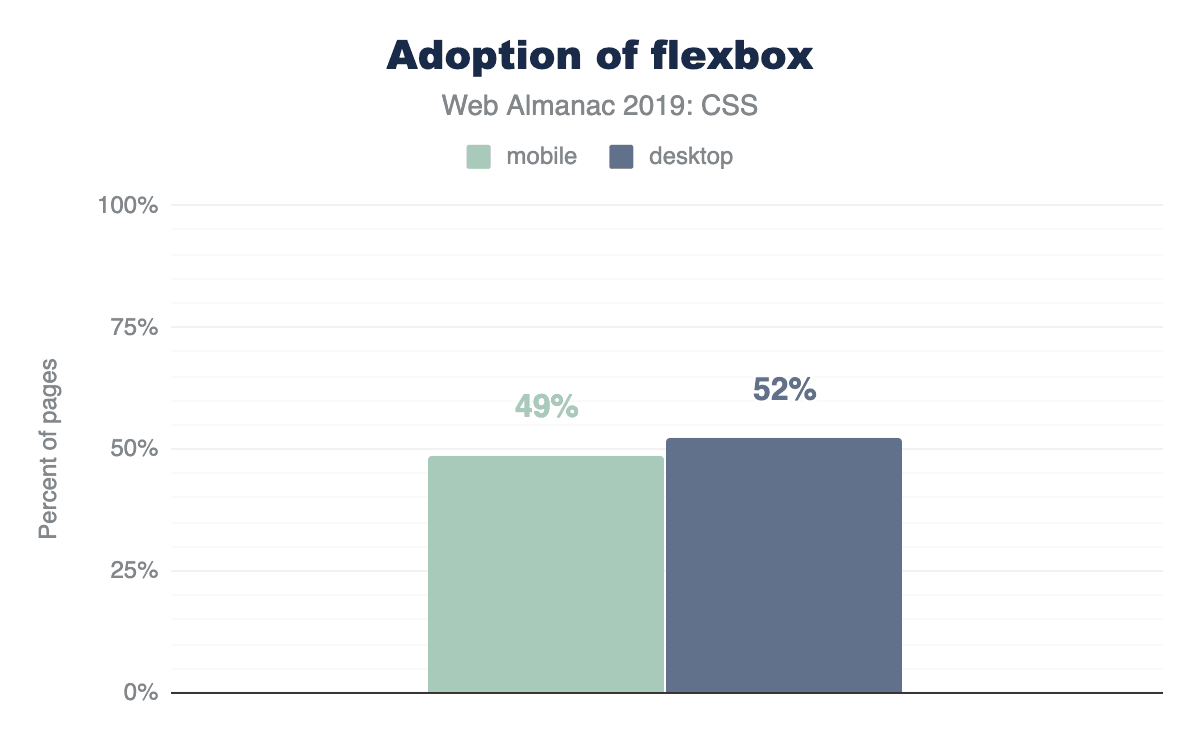 Quite the success story shown here, as nearly 50% of the web has flexbox usage in its stylesheets.