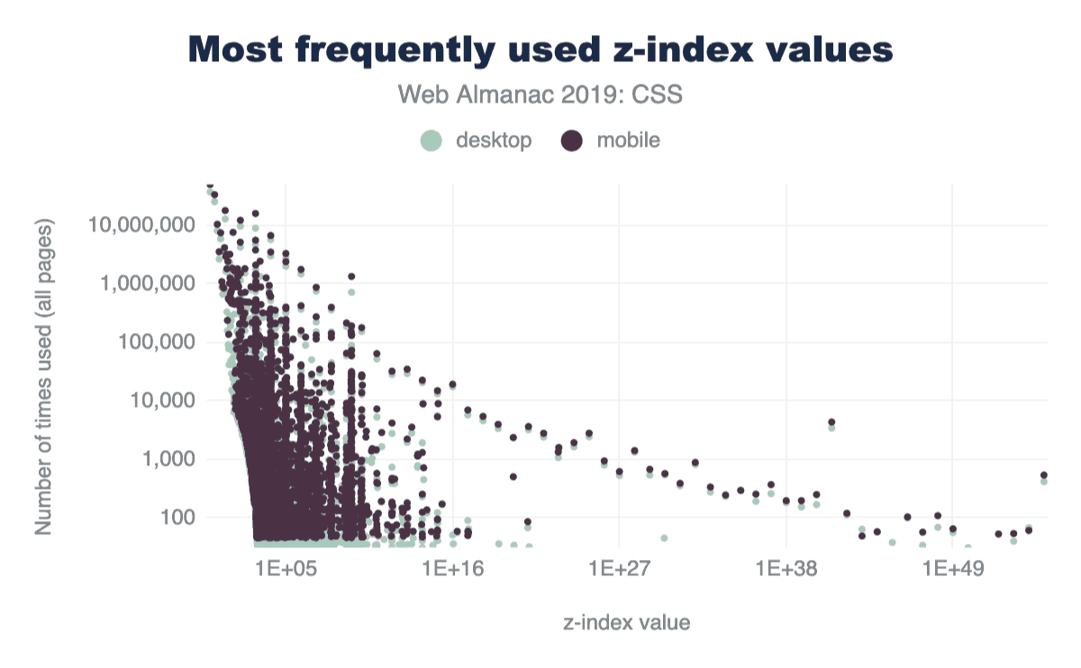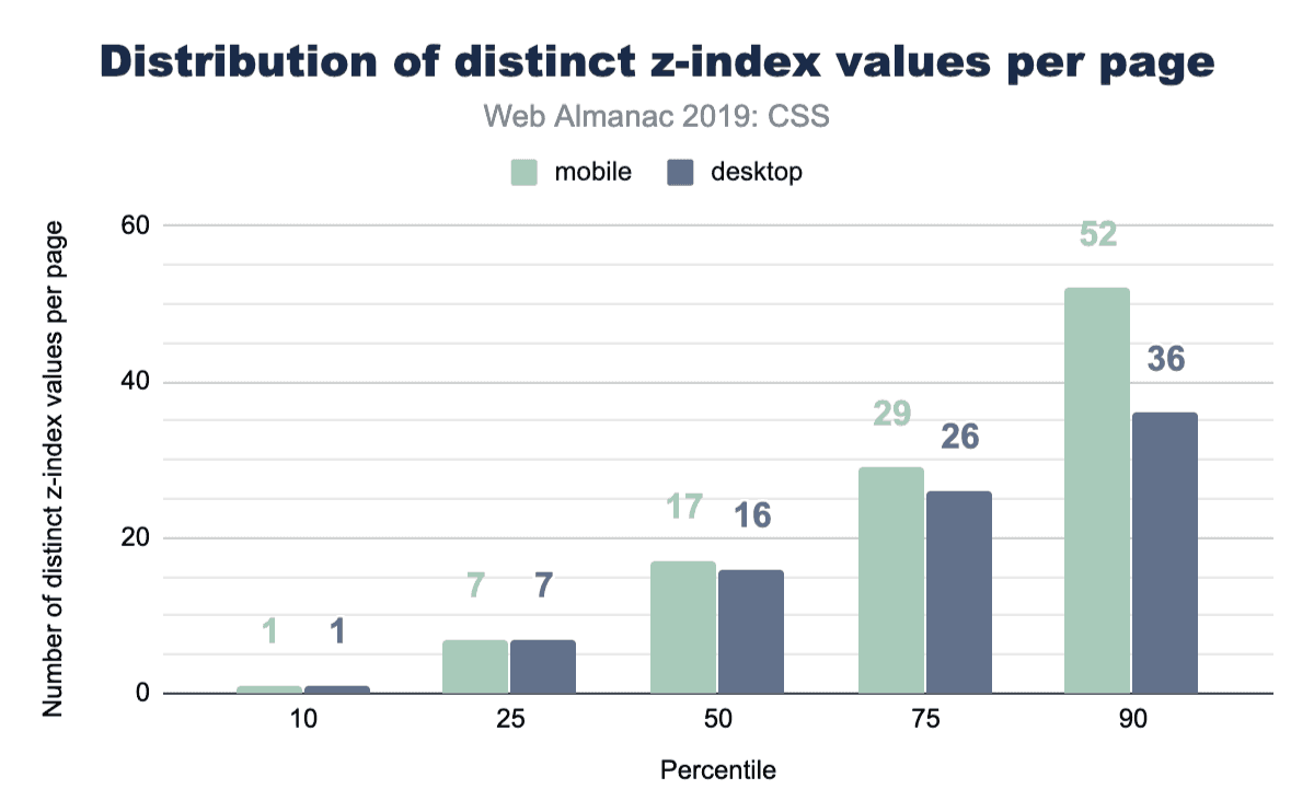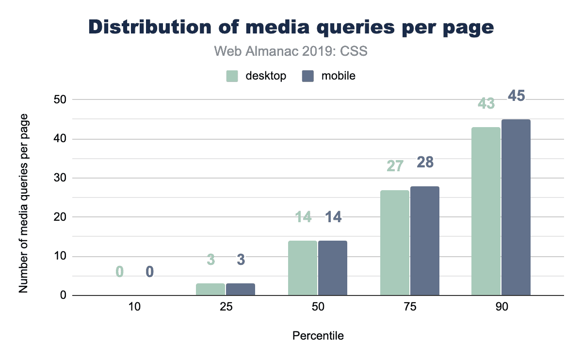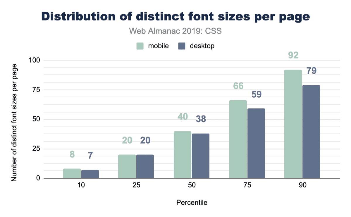 This is a fun one, because if you asked a user how many font sizes they feel are on a page, they’d generally return a number of 5 or definitely less than 10. Is that reality though? Even in a design system, how many font sizes are there? We queried the web and found the median to be 40 on mobile and 38 on desktop. Might be time to really think hard about custom properties or creating some reusable classes to help you distribute your type ramp.