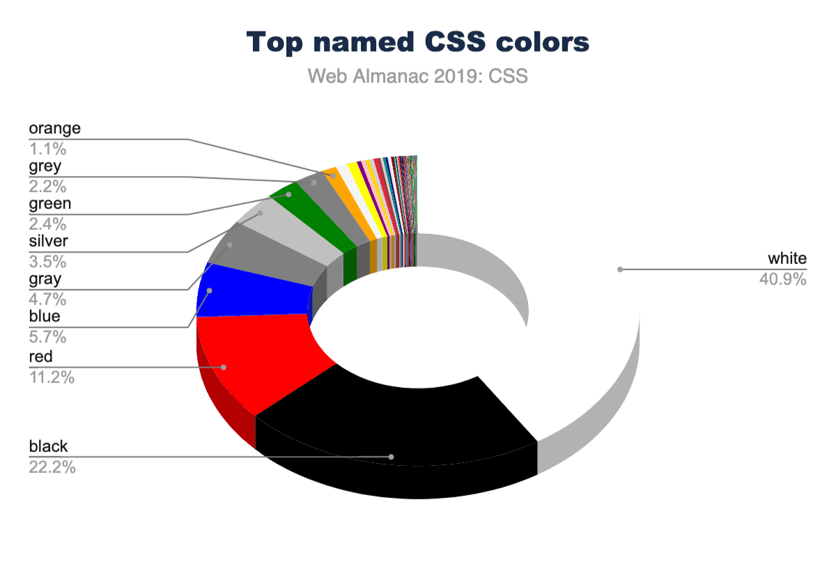 There are 148 named CSS colors, not including the special values transparent and currentcolor. You can use these by their string name for more readable styling. The most popular named colors are black and white, unsurprisingly, followed by red and blue.
