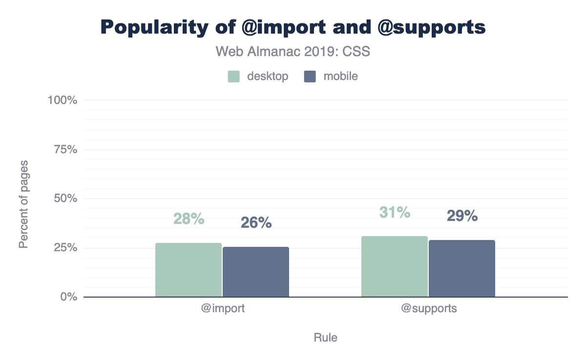 An interesting follow up to this is that there’s more usage of @supports than @imports! We did not expect that! @import has been in browsers since 1994.