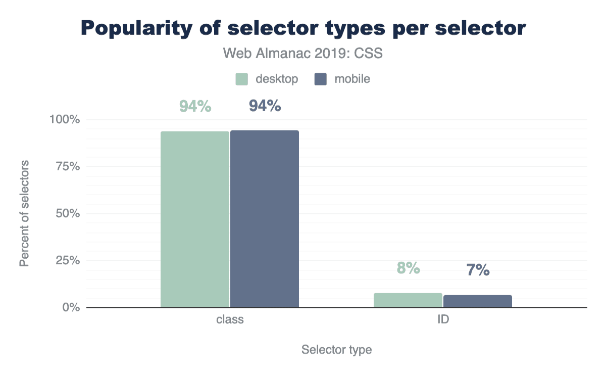 A nice follow up chart is this one, showing that classes take up 93% of the selectors found in a stylesheet.