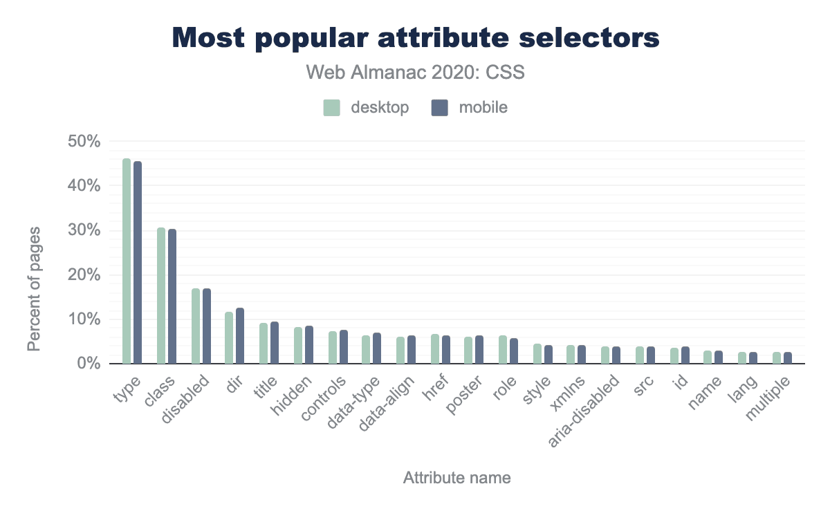 type, used on 46% of mobile pages. Next, the class attribute selector is used on 30% of mobile pages. The following attribute selectors are used on between 17 and 3% in descending order: disabled, dir, title, hidden, controls, data-type, data-align, href, poster, role, style, xmlns, aria-disabled, src, id, name, lang, and multiple.Pseudo-classes and pseudo-elements