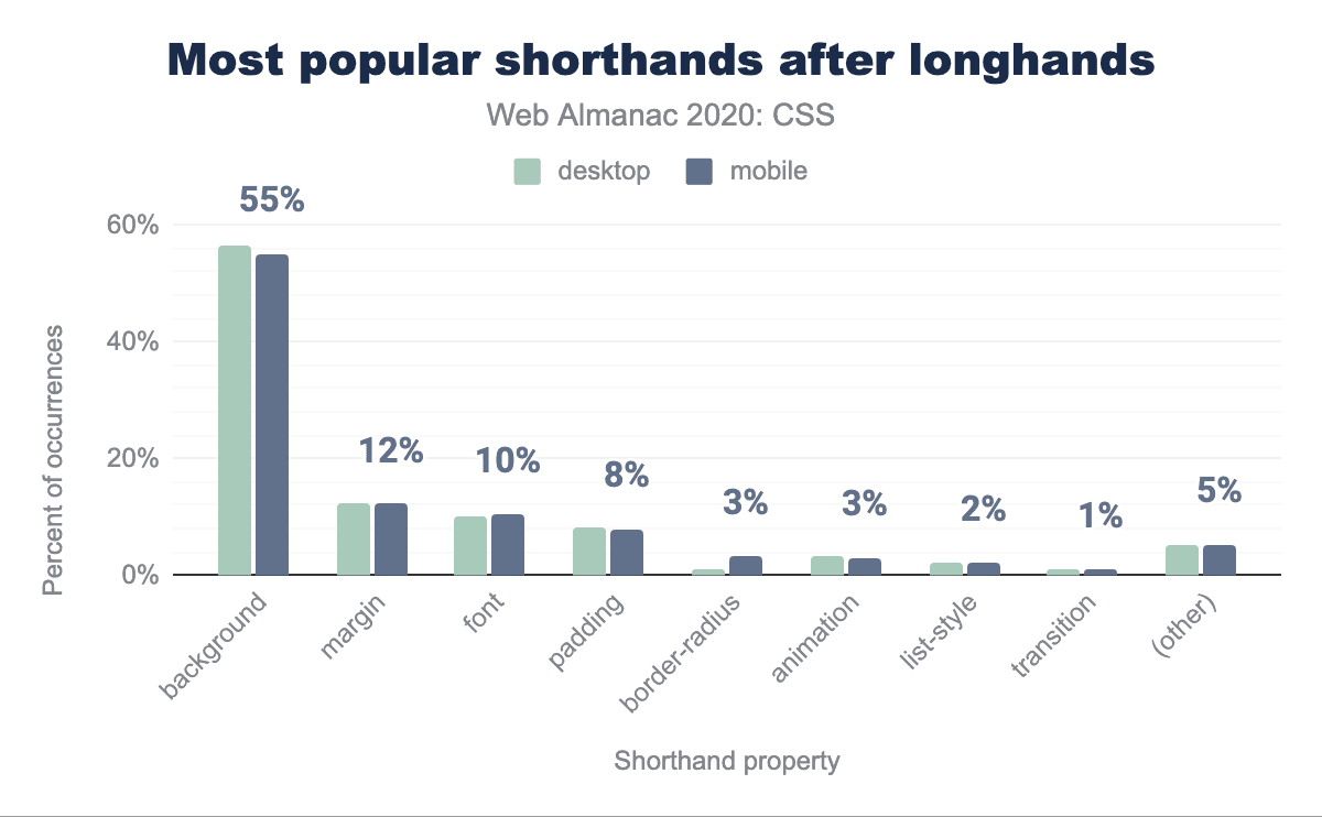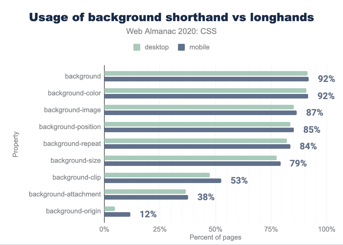 As one of the oldest shorthands, background is also highly used, appearing 1 billion times in 92% of pages. it is used more frequently than any of its longhands except background-color, which is used 1.5 billion times, in roughly the same number of pages. However, this doesn’t mean developers are fully comfortable with all of its syntax: nearly all (>90%) of background usage is very simple, with one or two values, most likely colors and images or images and positions. For anything further, the longhands are seen as more self-explanatory.