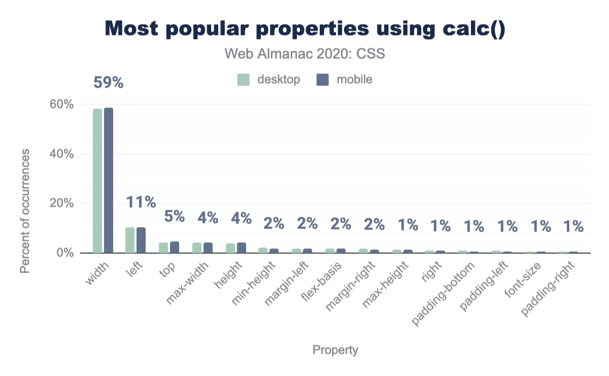 calc() is primarily used for lengths, with 96% of its usage being concentrated in properties that accept <length> values, and 60% of that (58% of total usage) on the width property!