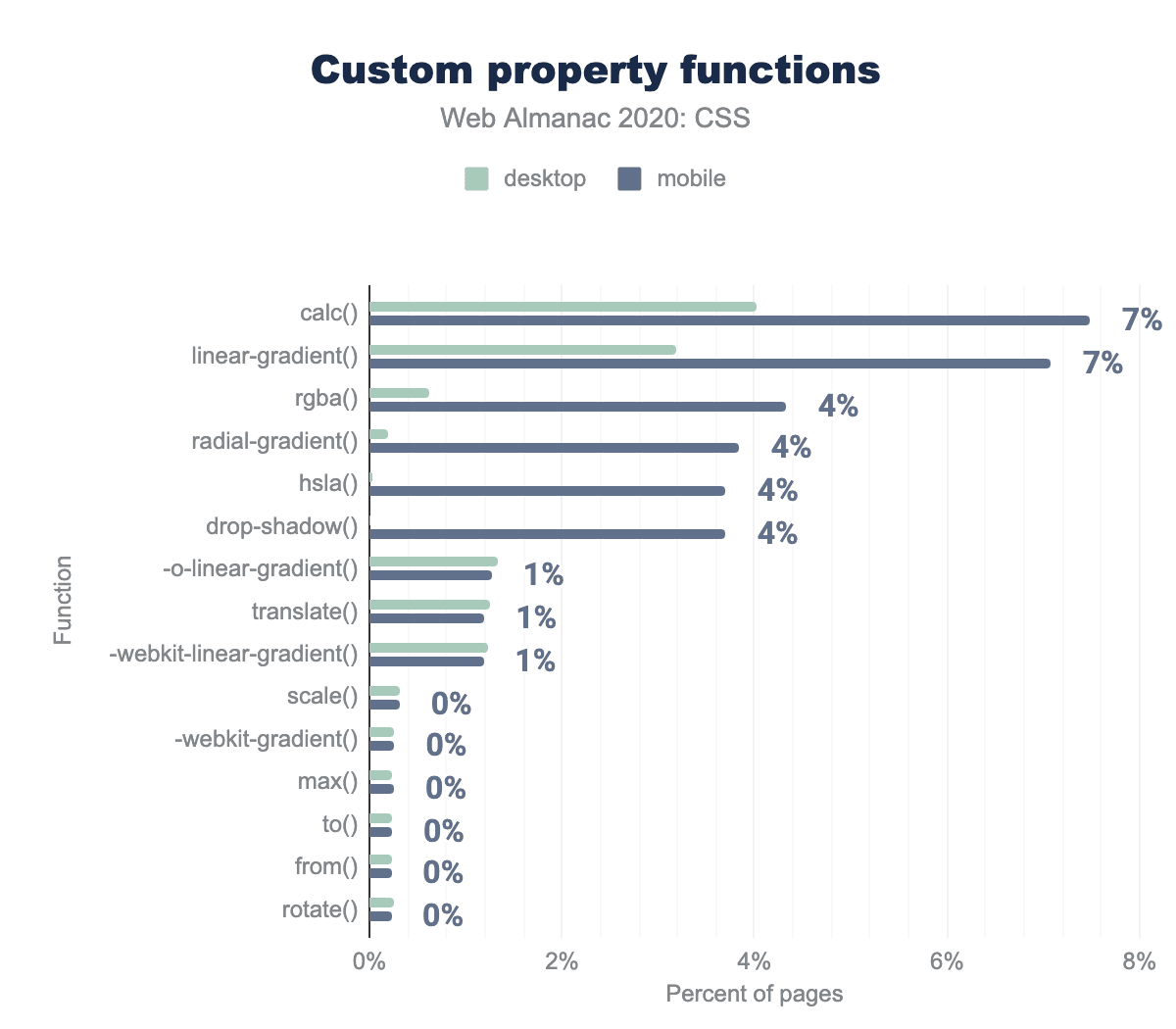 Today, calc() has been supported by every browser for nine years already, so it comes as no surprise that it has been widely adopted with 60% of pages using it at least once. If anything, we expected even higher adoption than this.
