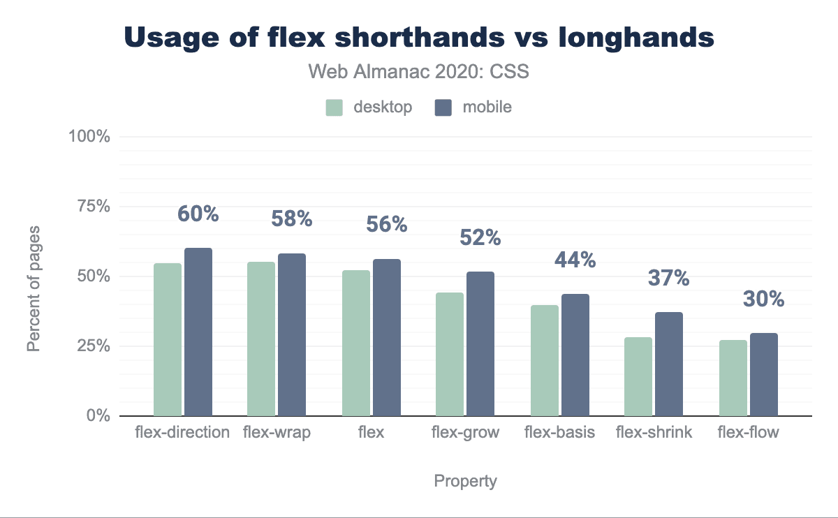 Nearly all flex, flex-* properties are very highly used, appearing in 30-60% of pages. However, both flex-wrap and flex-direction are used far more than their shorthand, flex-flow. When flex-flow is used, it is used with two values, i.e. as a shorter way to set both of its longhands. Despite the elaborate sensible defaults for using flex with one or two values, around 90% of usage consists of the 3 value syntax, explicitly setting all three of its longhands.