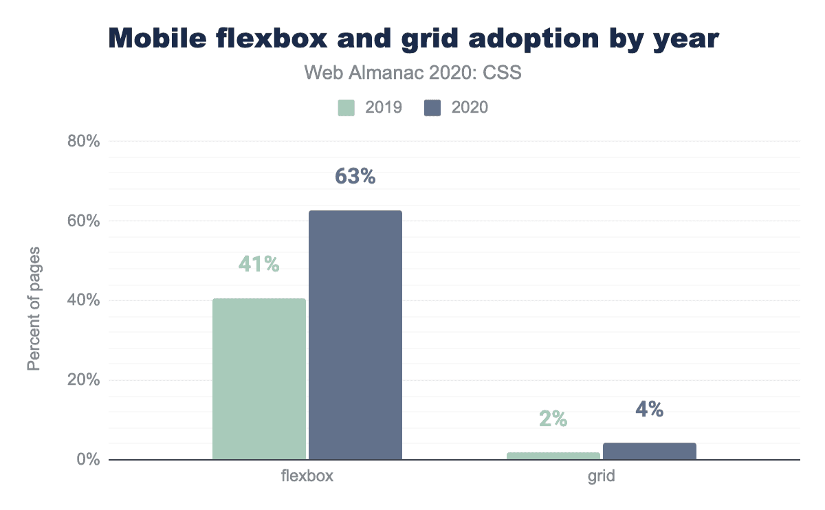 Overall, what we observed was a web in two different gears when it comes to CSS adoption. In our blog posts and Twitter bubbles, we tend to mostly discuss the newest and shiniest, however, there are still millions of sites using decade-old code. Things like vendor prefixes from a bygone era, proprietary IE filters, and floats for layout, in all their clearfix glory. But we also observed impressive adoption of many new features—even features that only got support across the board this very year, like min() and max(). However, there is generally an inverse correlation between how cool something is perceived to be and how much it is actually used; for example, cutting-edge Houdini features were practically nonexistent.