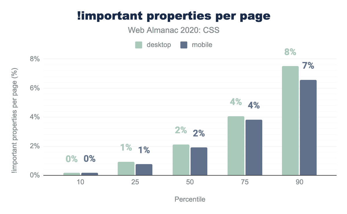 Instead, the old, crude !important is still used a fair bit despite its well-known drawbacks. The median page uses !important in nearly 2% of its declarations, or 1 in 50.