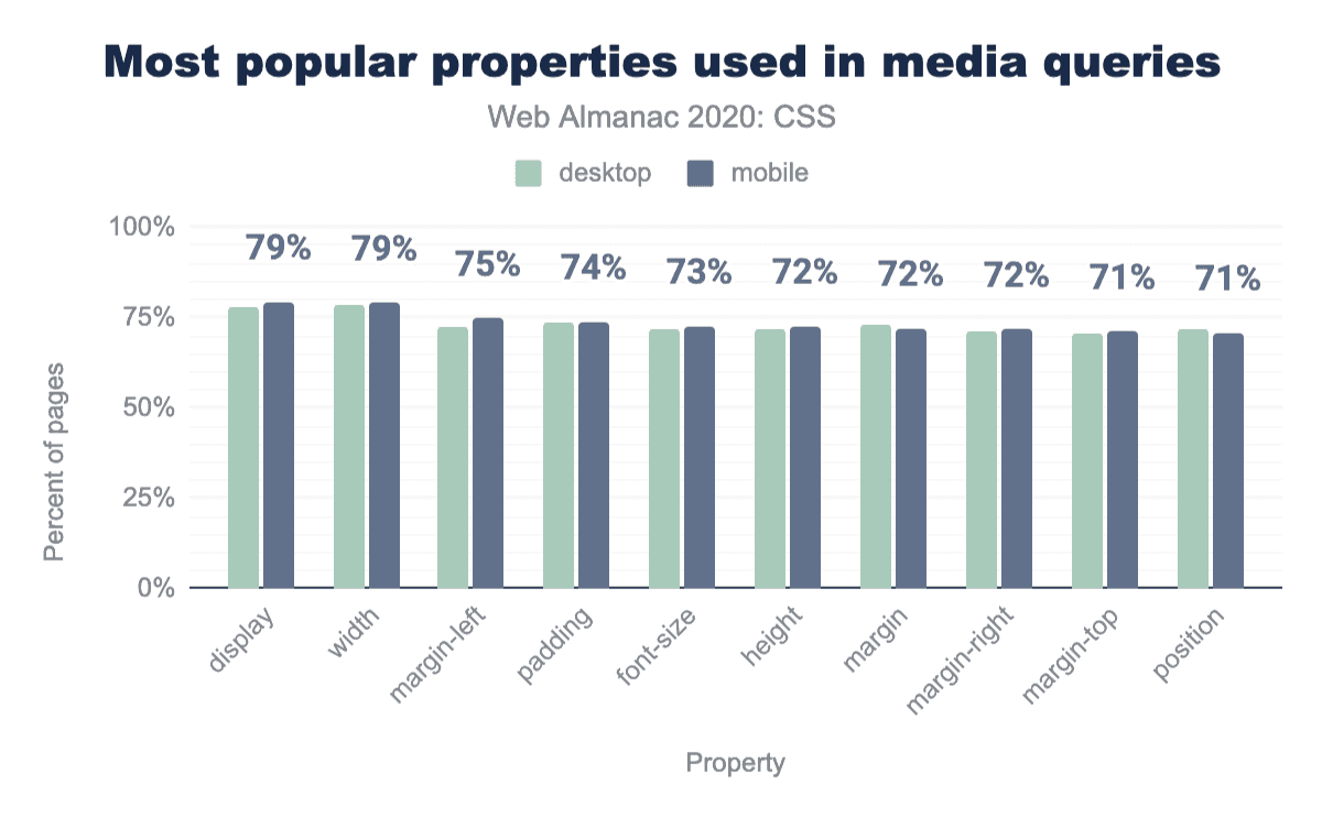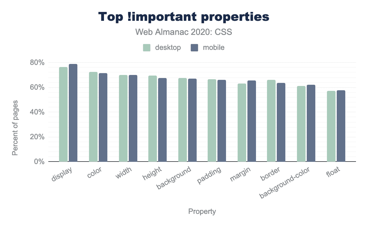 !important. Mobile and desktop have similar usage. The display property is used with !important the most, by 79% of mobile pages. In decreasing order, the subsequent properties on 71-58% of mobile pages are: color, width, height, background, padding, margin, border, background-color, and float.!important properties by the percent of pages.