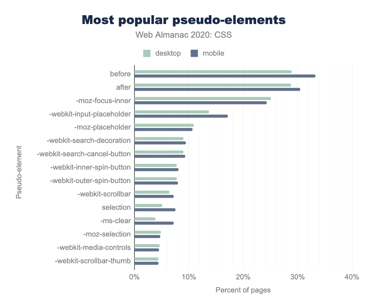 before, used on 33% of mobile pages. The after pseudo-element is used on 30% of mobile pages. -moz-focus-inner is used on 24% of pages. The popularity drops after those from 17% to 4% in decreasing order: -webkit-input-placeholder, -moz-placeholder, -webkit-search-decoration, -webkit-search-cancel-button, -webkit-inner-spin-button, -webkit-outer-spin-button, -webkit-scrollbar (7%), selection, -ms-clear, -moz-selection, -webkit-media-controls, and -webkit-scrollbar-thumb.Values and units