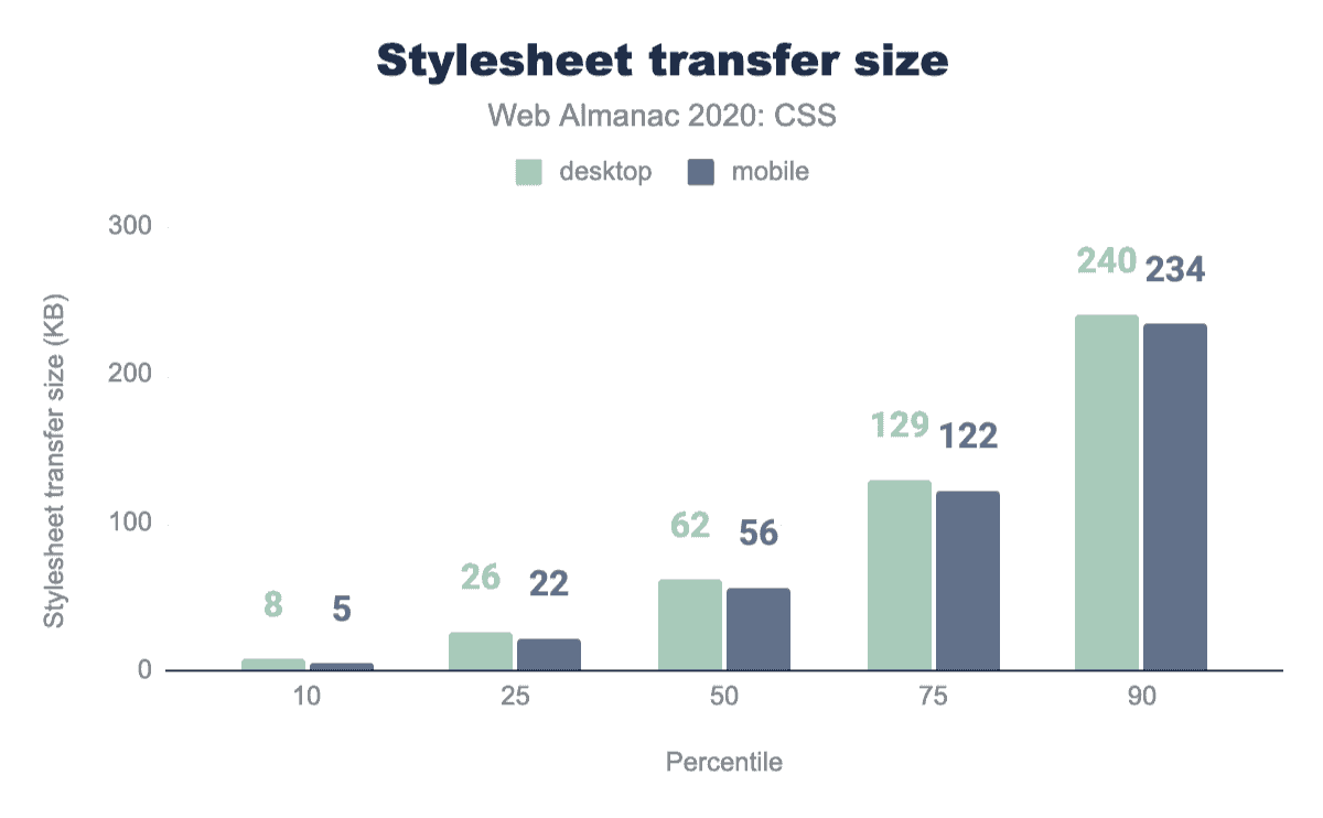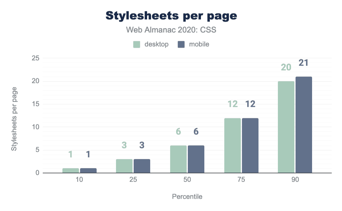 All these kilobytes of code are typically distributed across multiple files and <style> elements; only about 7% of pages concentrate all their CSS code in one remote stylesheet, as we are often taught to do. In fact, the median page contains 3 <style> elements and 6 remote stylesheets, with 10% of them carrying over 14 <style> elements and over 20 remote CSS files! While this is suboptimal on desktop, it really kills performance on mobile, where round-trip latency is more important than raw download speed.