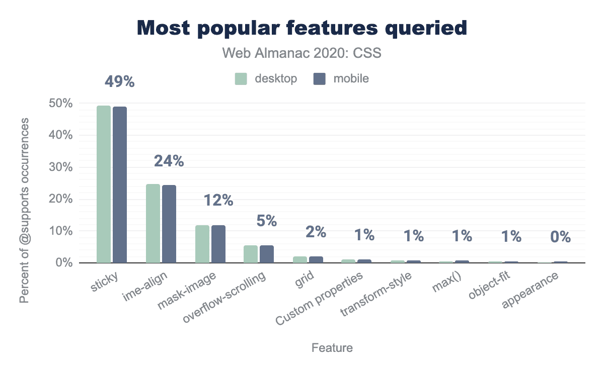 What is even more mysterious is that position: sticky itself is not used as much as the feature queries about it, appearing in 10% of desktop pages and 13% of mobile pages. So there are over half a million pages that detect position: sticky without ever using it! Why?!