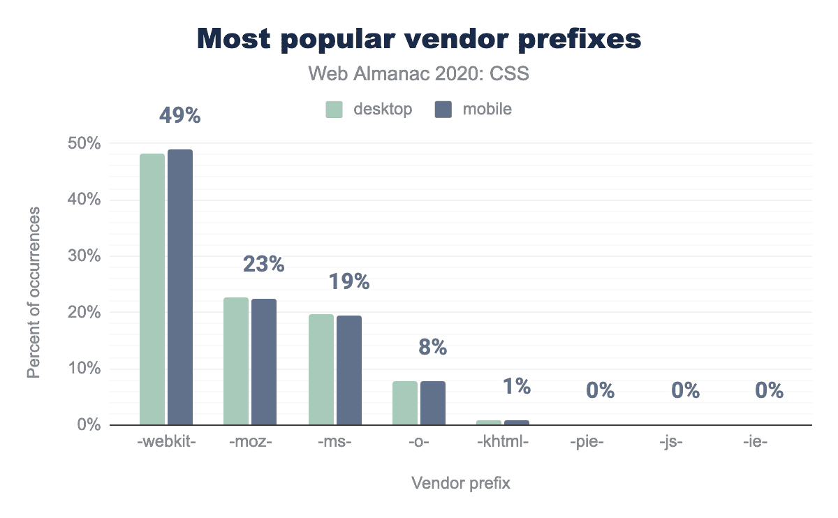 -webkit makes up 49% of vendor prefix usage on mobile pages, -moz 23%, -ms 19%, -o 8%, -khtml 1%, and 0% for -pie, -js, and -ie. Desktop is similar.Prefixed pseudo-classes are not nearly as common as properties, with none of them being used in more than 10% of pages. Nearly two thirds of all prefixed pseudo-classes overall are for styling placeholders. In contrast, the standard :placeholder-shown pseudo-class is barely used, encountered in less than 0.34% of pages.