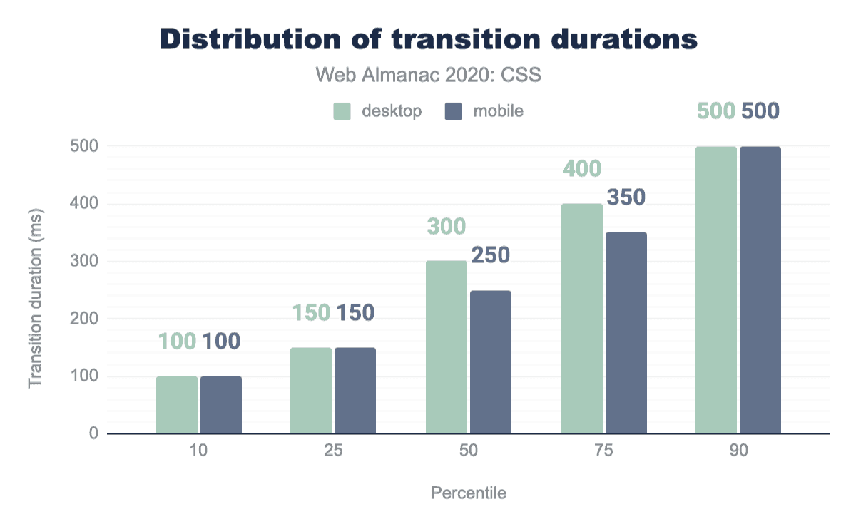 Similarly, in our conference talks, we often tend to focus on complicated, elaborate use cases that make heads explode and Twitter feeds fill with “CSS can do that?!”. However, it turns out most CSS usage in the wild is fairly simple. CSS Variables are mostly used as constants and rarely refer to other variables, calc() is mostly used with two terms, gradients mostly have two stops and so on.