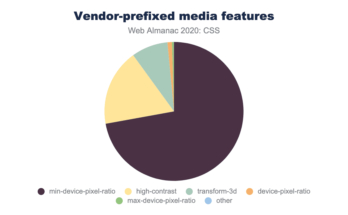 Overall, -*-min-pixel-ratio comprises three quarters of prefixed media features on desktop and about half on mobile. The reason for the difference is not reduced mobile usage, but that another prefixed media feature, -*-high-contrast, is far more popular on mobile making up almost the entire other half of prefixed media features, but only 18% on desktop. The corresponding standard media feature, forced-colors is still experimental and behind a flag in Chrome and Firefox and did not appear at all in our analysis.