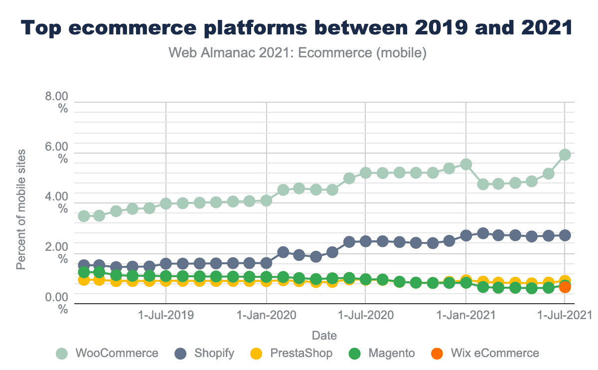 WooCommerce, a plugin for WordPress, is the most prevalent ecommerce platform with almost 6% of all websites using it. This represents 30% of the ecommerce market on mobile.
