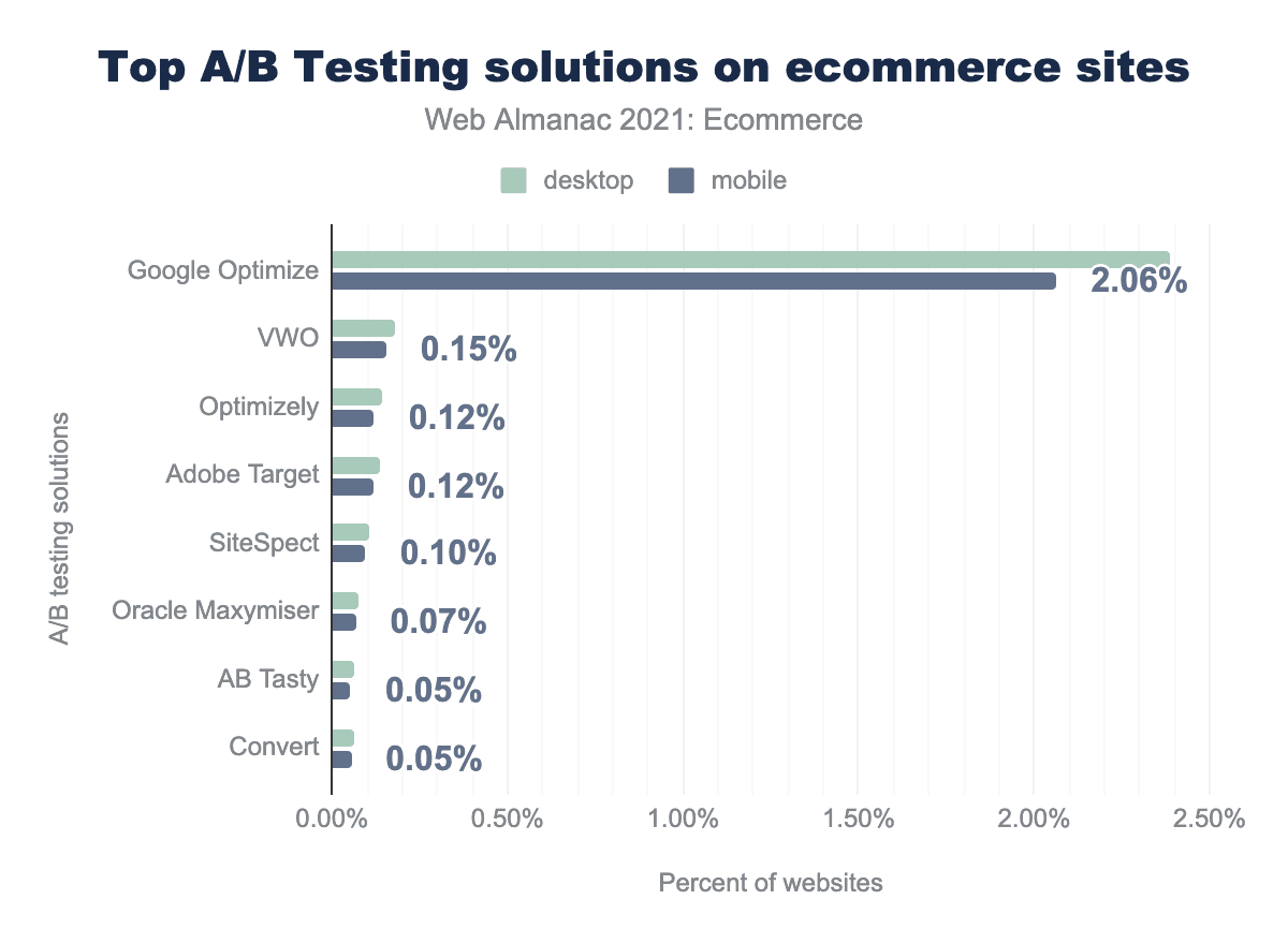 Google Optimize is the most popular A/B testing tool in use on 2.06% of mobile ecommerce sites. VWO was the second most common solution but was found on less than one-tenth the number of sites compared to Google Optimize (0.15% on mobile).