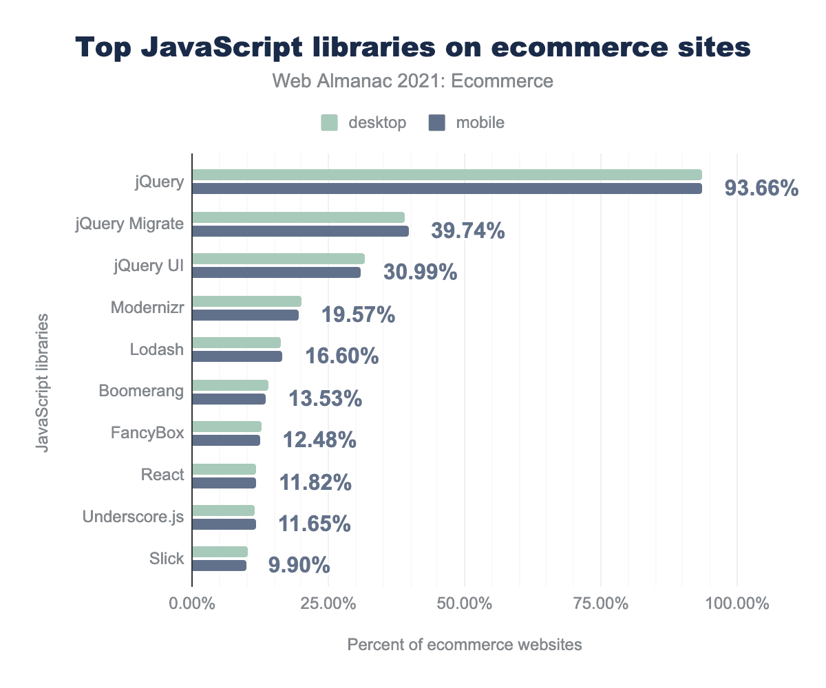 We see that jQuery is still the most popular library. Reports of its demise are greatly exaggerated. 93.66% of ecommerce websites profiled were still using it. Many of the popular ecommerce vendors provide jQuery as part of the default frontend. On top of that platforms also live and die by the app and plugin ecosystems where additional functionality can be bought off of the shelf. These solutions also regularly use jQuery to provide functionality cost-effectively.