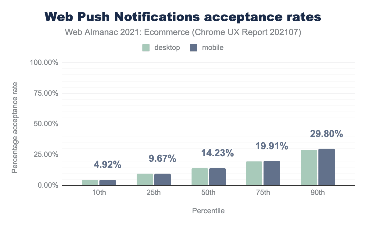We tried to look at the adoption of web push notifications by ecommerce sites using the Chrome User Experience report. As this is generated from real user data, we can also see the approval rates for push permission requests. Please refer to this Google article for more details on how this data is captured and what metrics are available.