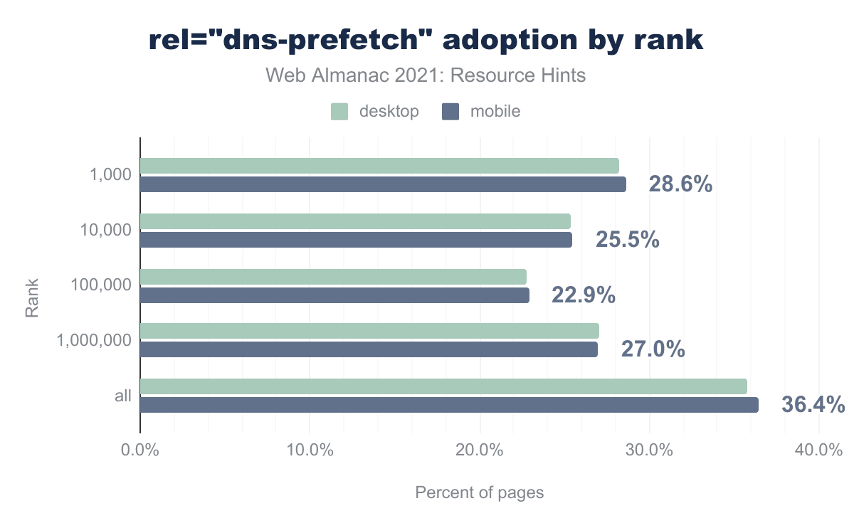 rel="dns-prefetch" segmented by CrUX rank. rel="dns-prefetch" has a 28.6% for the top 1,000 sites on mobile and 28.2% on desktop. rel="dns-prefetch" has a 25.5% for the top 10,000 sites on mobile and 25.3% on desktop. rel="dns-prefetch" has a 22.9% for the top 100,000 sites on mobile and 22.7% on desktop. rel="dns-prefetch" has a 27.0% for the top 1 million sites on mobile and 27.1% on desktop. rel="dns-prefetch" has a 36.4% for all sites on mobile and 35.7% on desktop.rel="dns-prefetch" segmented by CrUX rank.