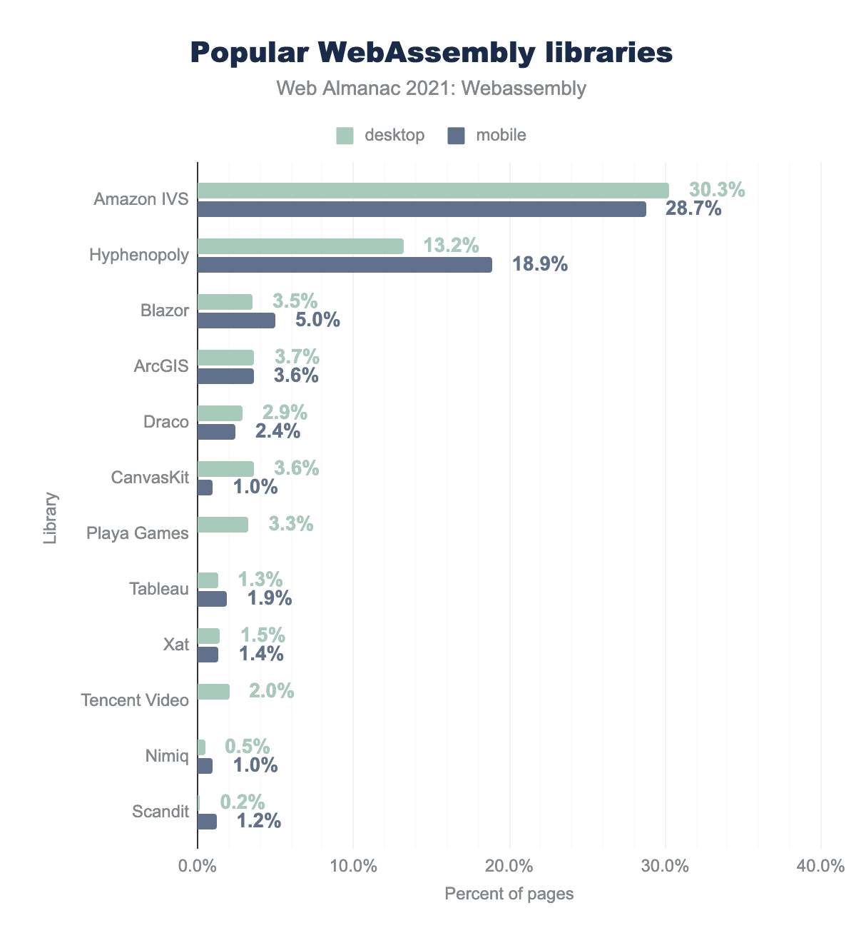 Almost a third of WebAssembly usages on both desktop and mobile belong to the Amazon Interactive Video Service player library. While it’s not open-source, the inspection of the associated JavaScript glue code suggests that it was built with Emscripten.