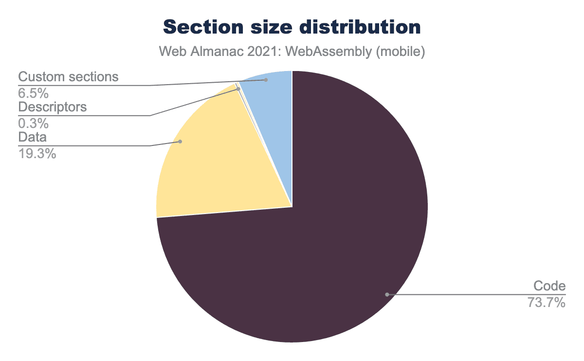 Compression aside, we could also look for optimization opportunities by analyzing the high-level structure of WebAssembly binaries. Which sections are taking up most of the space? To find out, we’ve summed up section sizes from all the Wasm modules and divided them by the total binary size. Once again, we used numbers from the mobile dataset here, but desktop numbers aren’t too far off: