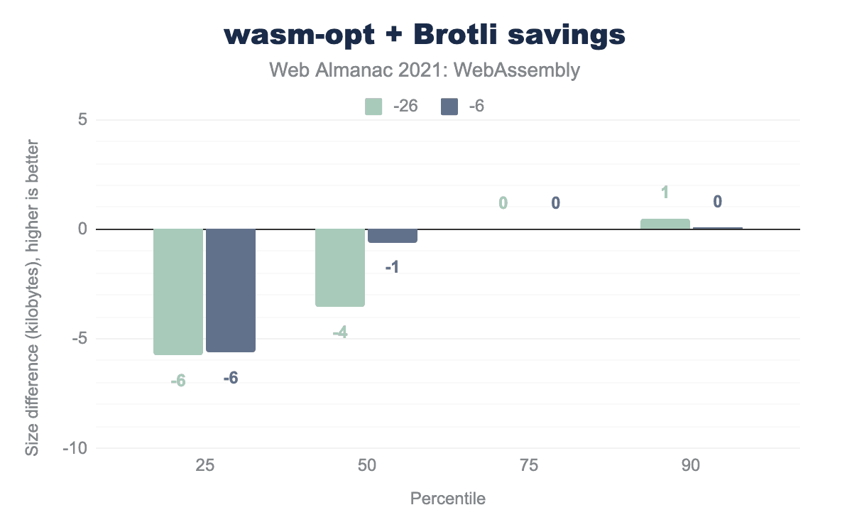 wasm-optparameters, whereas some users might have tweakedwasm-optflags in a way that produces even better savings for their particular modules. - As mentioned earlier, the network (compressed) size is not everything. Smaller WebAssembly binaries tend to mean faster compilation in the VM, less memory consumption while compiling, and less memory to hold the compiled code.