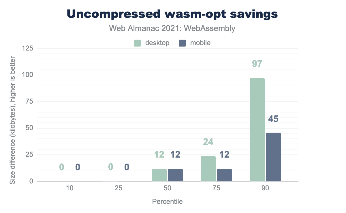 wasm-opt on the same datasets, but this time without Brotli. 10 percentiles and 25 percentiles shows an insignificant or no improvement of 0 kilobytes on desktop and mobile, median shows an improvement of 12 KB on both, 90percentiles shows improvements of almost 100 KB on desktop and 45 KB on mobile.wasm-opt savings.