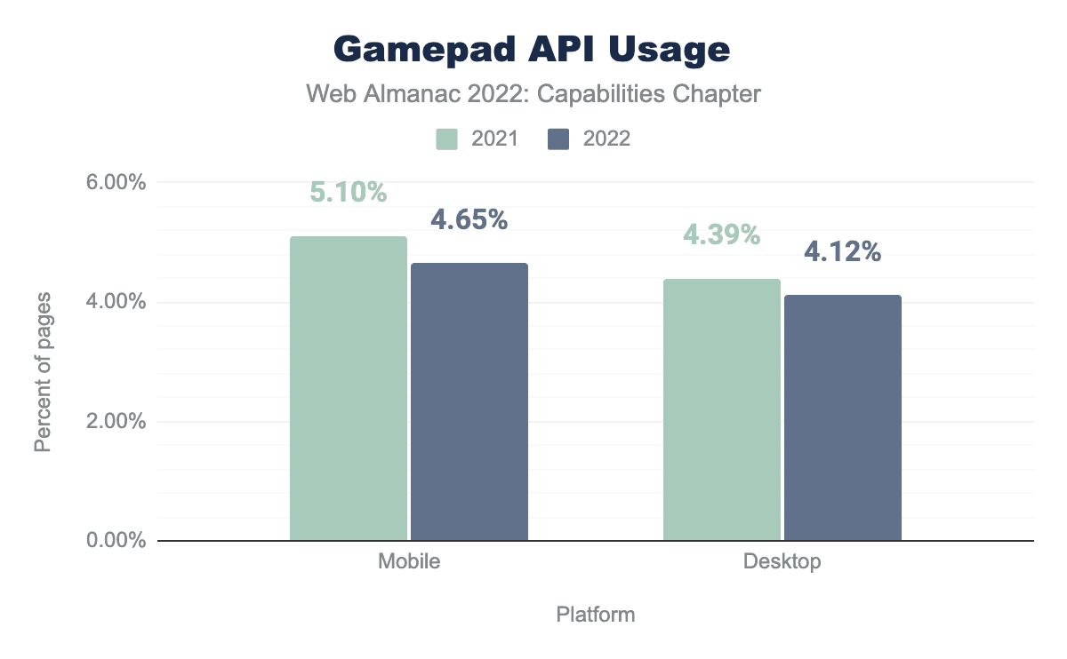 The Gamepad API shrunk in usage from 4.39% in 2021 to 4.12% in 2022 on desktop. On mobile, use shrunk from 5.10% in 2021 to 4.65% in 2022. As a result, this year, the Gamepad API was the seventh most used capability on desktop and the sixth most used mobile.