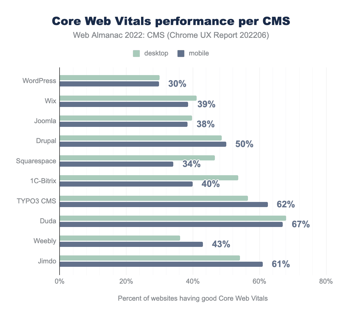 Desktop device experience was better for most CMSs. Duda had the largest CWV passing rate at 68%. WordPress had the lowest ratio of passing sites: 30%.