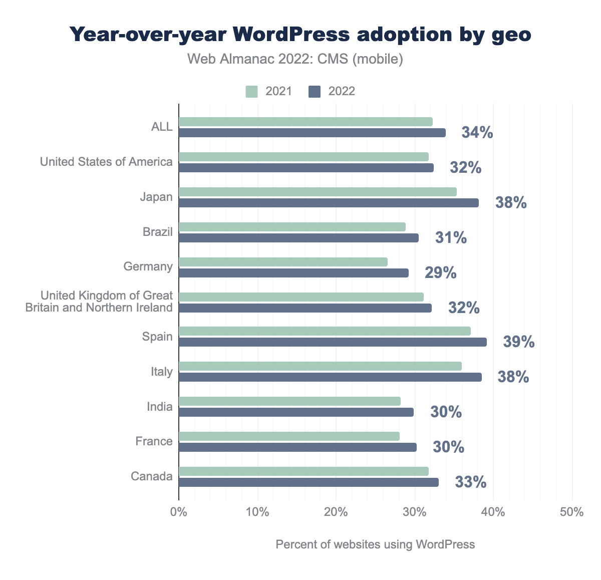First, we examined WordPress adoption by geography across all sites in our dataset in comparison to our 2021 results.