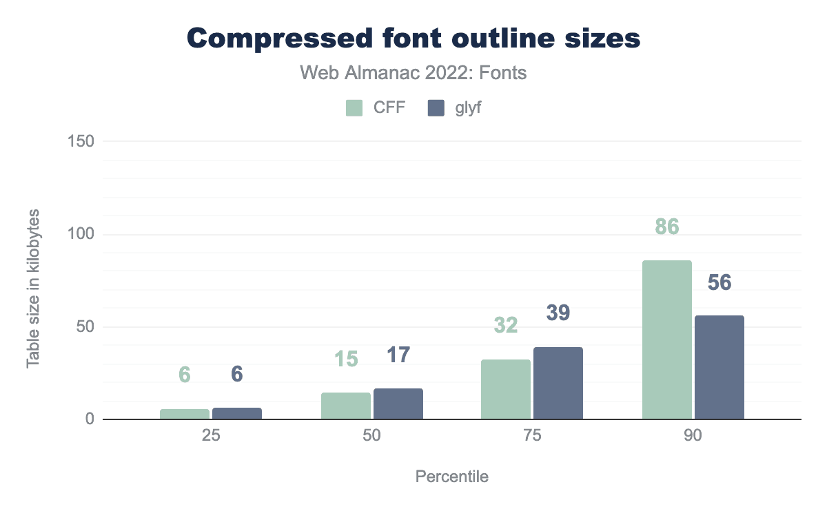CFF is 1 KB and glyf 10 KB, at the 25th percentile it’s 14 and 21 respectively, at the 50th percentile it’s 29 and 49, at the 75th percentile it’s 54 and 109, and finally at the 90th percentile CFF is 124 KB and glyf 136 KB.On average, CFF does indeed produce a smaller table size. However, the reality is more nuanced, as it doesn’t take compression into account—the table sizes are recorded after the font has been uncompressed.