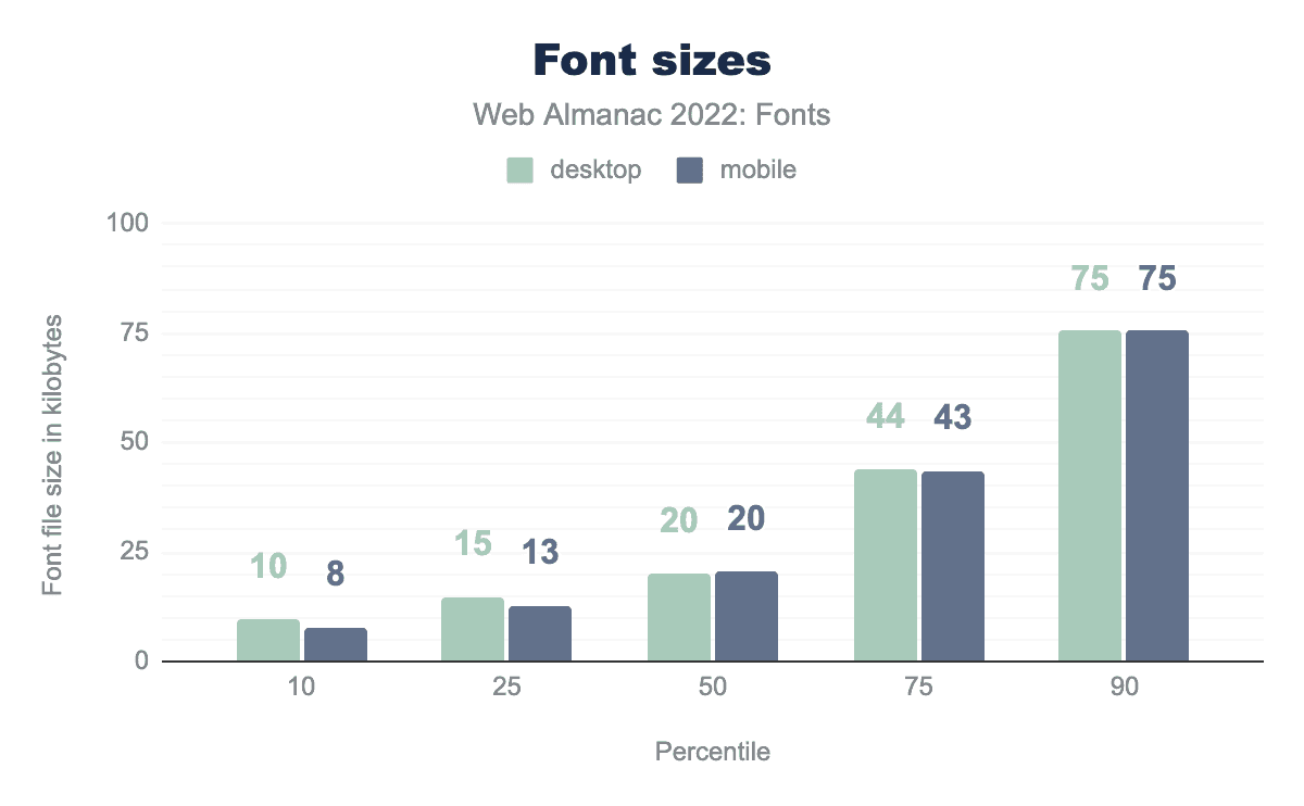 Compression is a great way to reduce the amount of data that needs to be downloaded, but it has its limits. To better understand what influences font file sizes, let’s take a look at the median font sizes across all fonts.