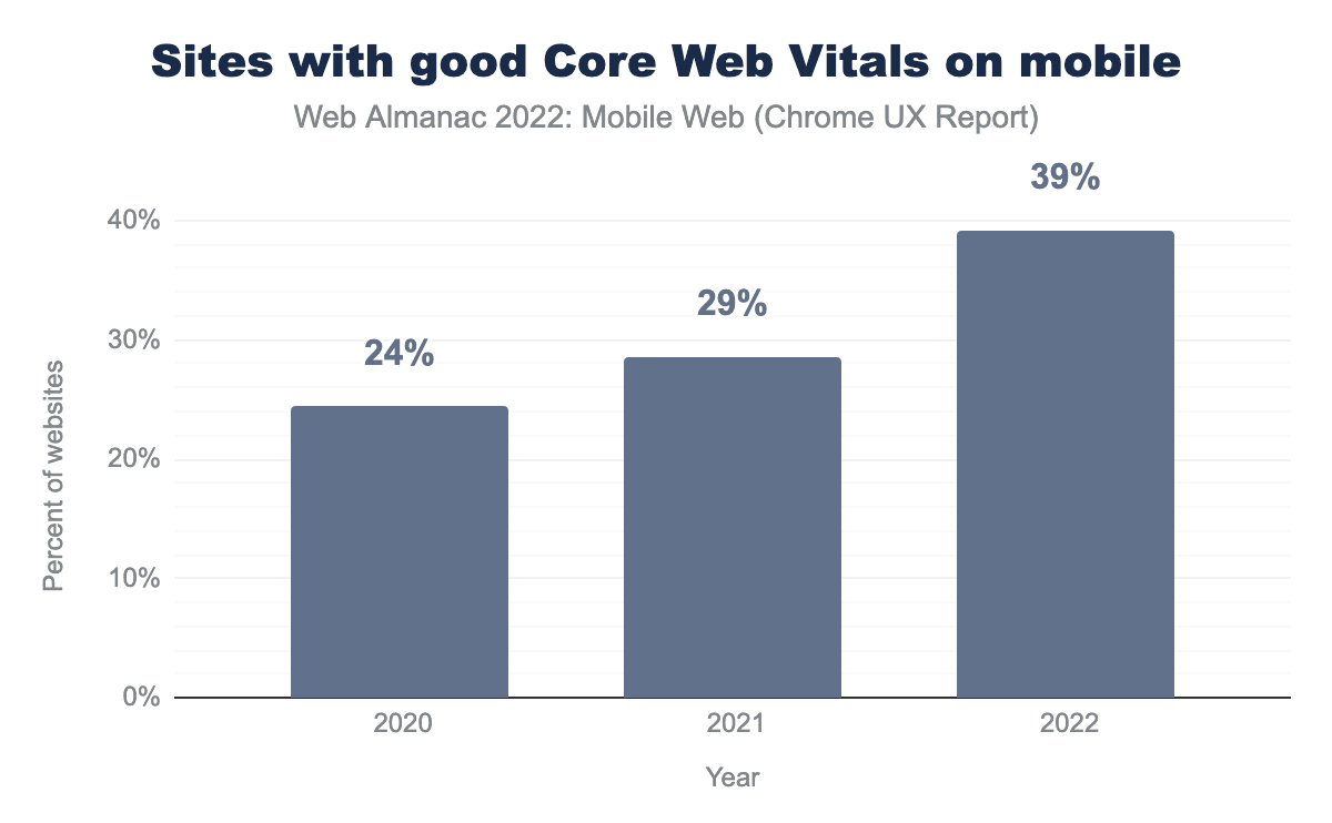 As you can see above, there are only minor fluctuations in the percent of mobile sites that are considered “good” from 2020 to 2022, going from 41% in 2020 down to 39% in 2021, then back up to 40% in 2022.