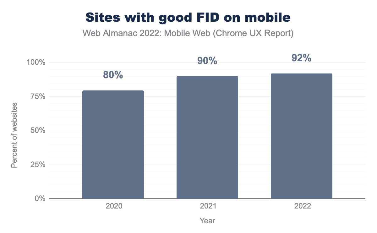 There has been a consistent growth in the percent of mobile sites that have “good” FID in the past three years, going from only 80% in 2020 to 90% in 2021, and reaching 92% in 2022.