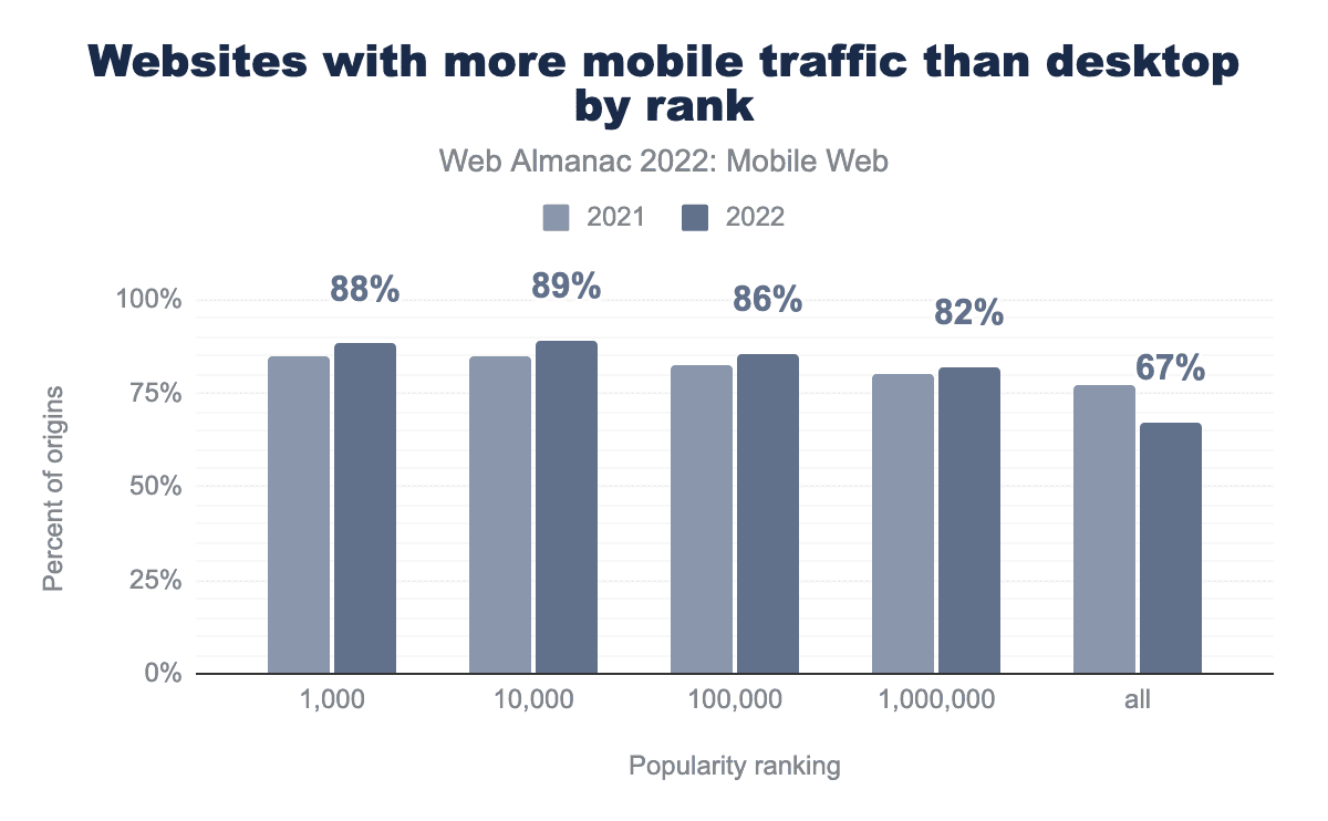 According to Oberlo, about 58% of web traffic in 2022 is from mobile devices. The consistent growth and pervasiveness of these statistics is a clear indication of the obvious increasing importance in the overall evaluation of mobile web access and interactions.