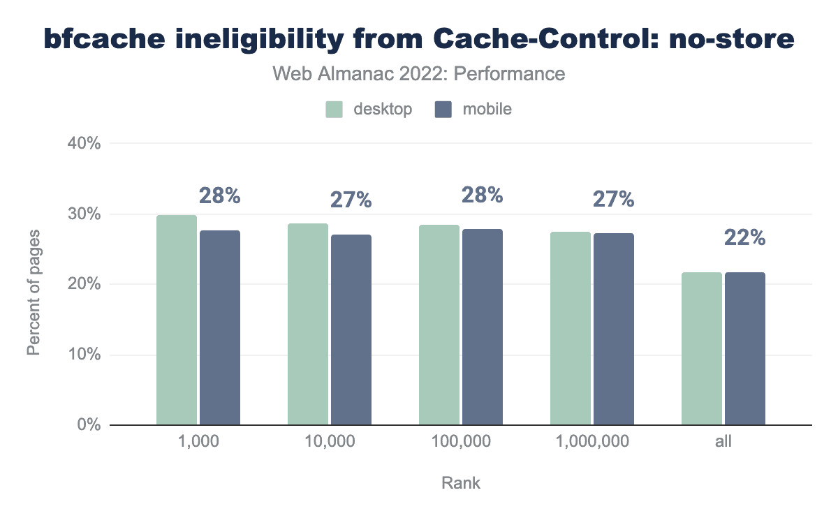 The cause of this improvement seems to come down to Chrome’s launch of bfcache, which is reflected in the January 2022 CrUX dataset. However, at least a fifth of sites are ineligible for this feature due to aggressive no-store caching policies or discouraged use of the unload event listener. Correcting these anti-patterns is CLS’s “one weird trick” to improve performance.