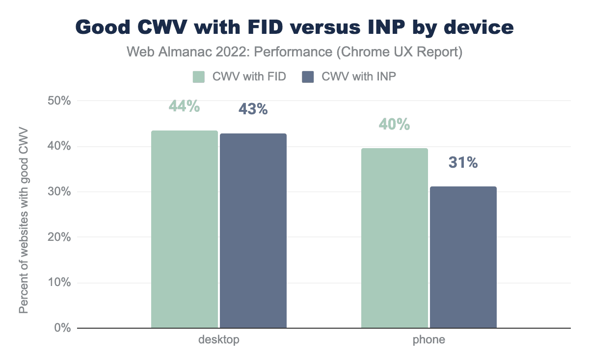 However, the disparity is much more dramatic among websites’ mobile experiences, which would fall to 31% having good CWV with INP, from 40% with FID.