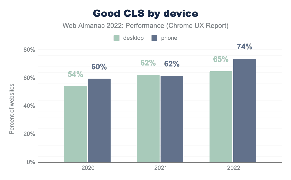 This year, 51% of websites have good LCP experiences on mobile and 63% on desktop. LCP appears to be one of the major reasons why websites’ mobile experiences have gotten so much better in 2022, having a 6 percentage point improvement this year.