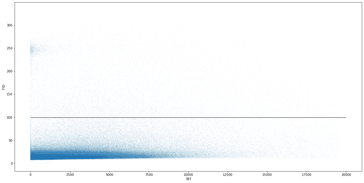 Pages in this chart are more densely packed in the bottom left corner, which signifies the higher degree of correlation between FID and TBT. There’s still a smear, but it’s not as pronounced.