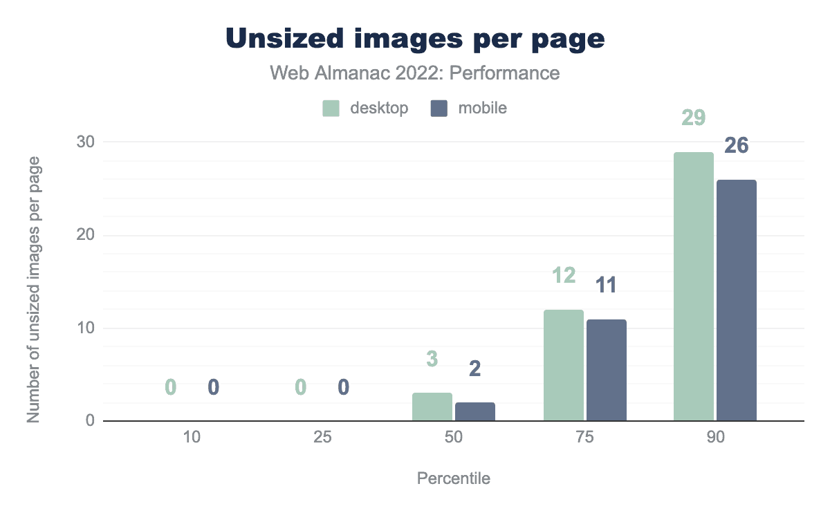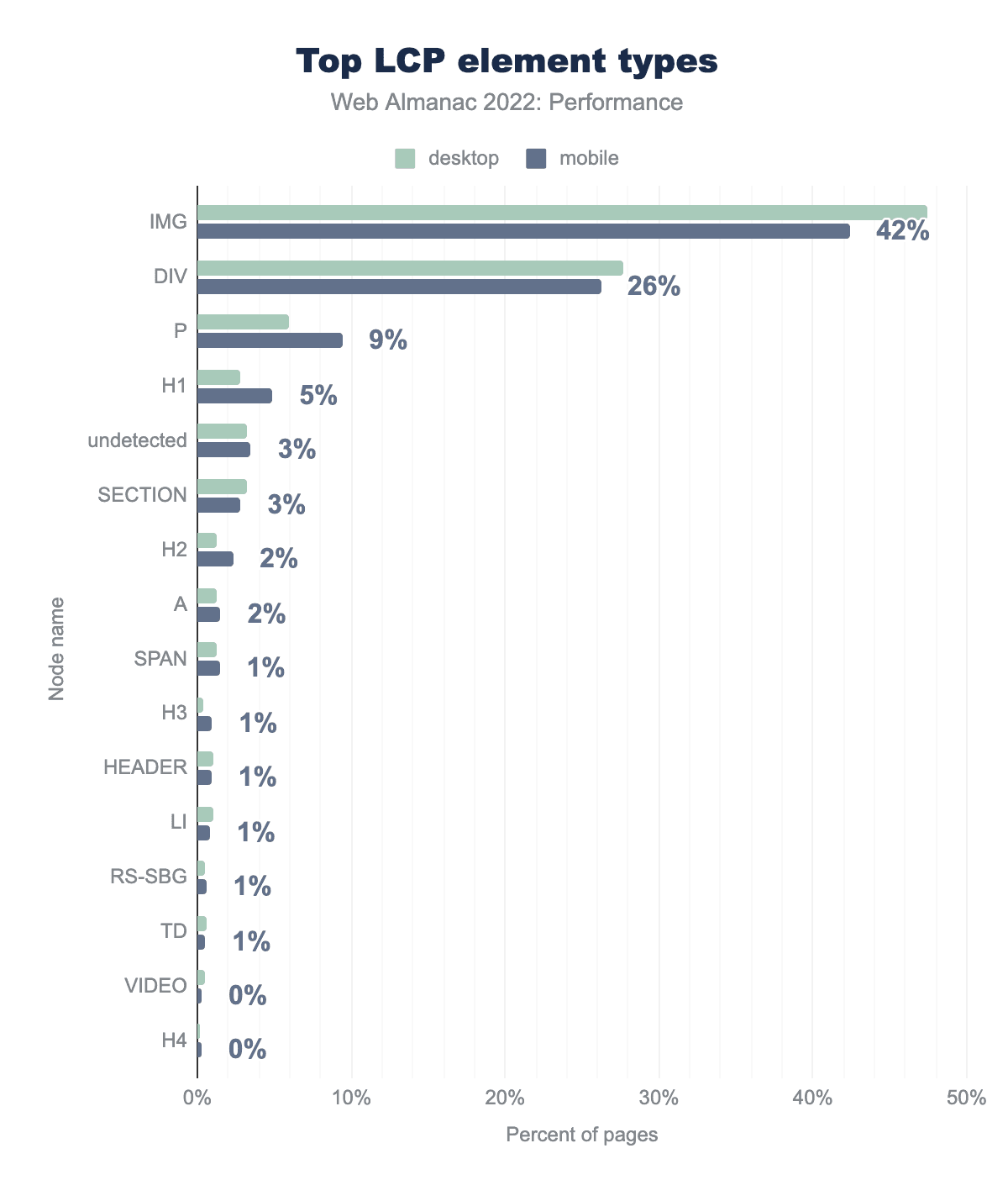 It’s clear that images are the most common type of LCP content, with the img element representing the LCP on 42% of mobile pages. Mobile pages are slightly more likely to have heading and paragraph elements be the LCP than desktop pages, while desktop pages are more likely to have image elements as the LCP. One possible explanation is the way that mobile layouts—especially in portrait orientation—make images that are not responsive appear smaller, giving way to large blocks of text like headings and paragraphs to become the LCP elements.