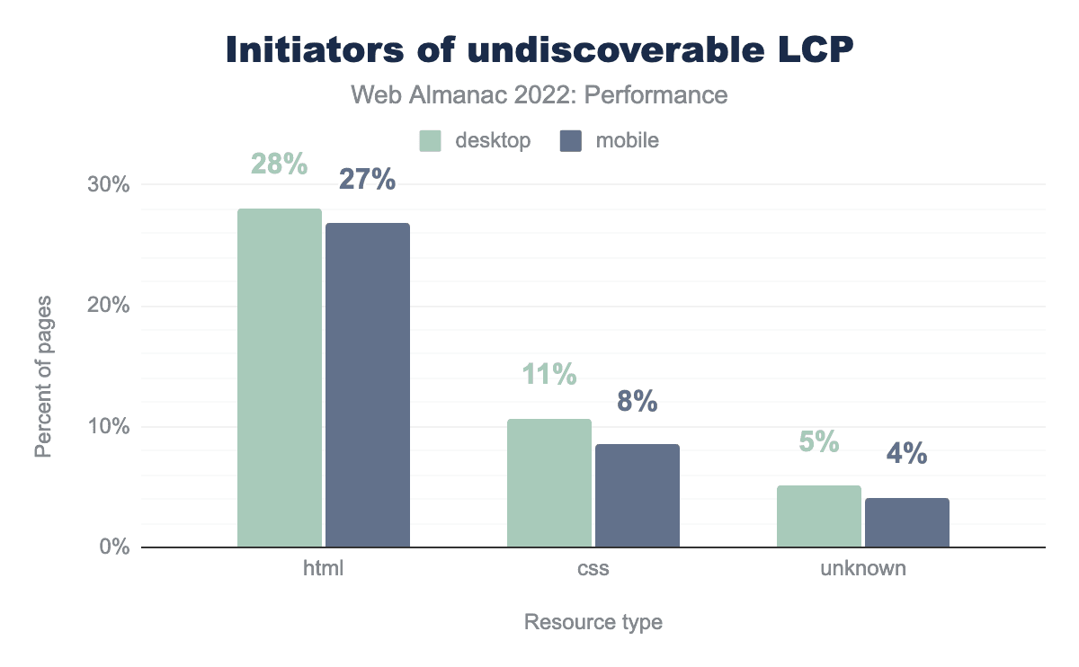 4% of mobile pages have an undiscoverable LCP initiator whose type we’re unable to detect. These may be a combination of HTML and CSS initiators.