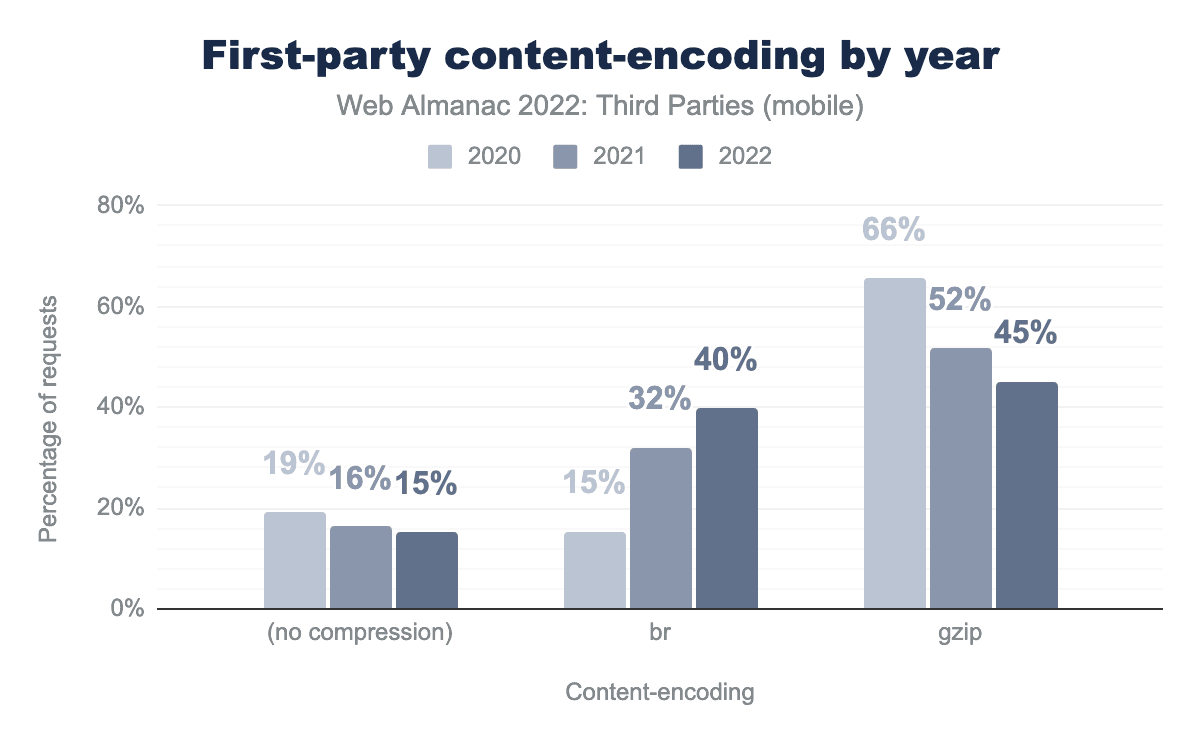 The rate of first-party scripts compressed via brotli almost tripled, increasing from 15% to 40%.