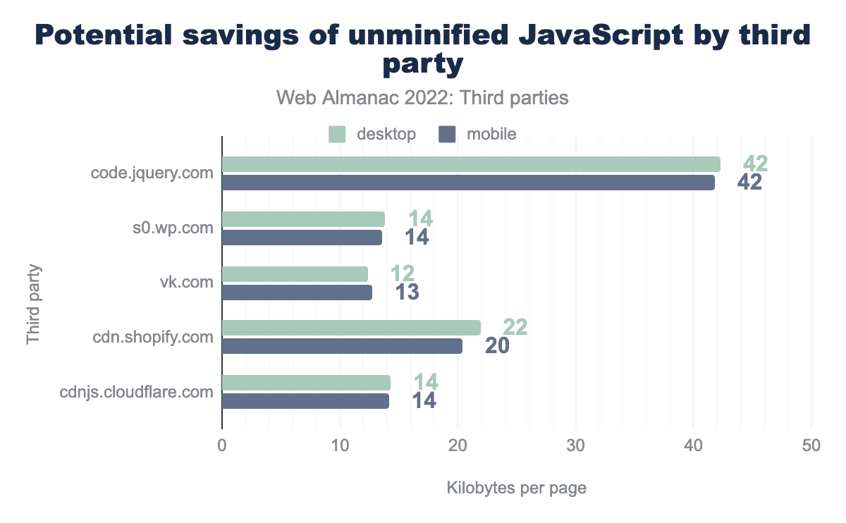 code.jquery.com are 42 kilobytes for mobile pages, from s0.wp.com 14 kilobytes, from vk.com 13, from shopify.com 20 and from cloudflare.com 14 kilobytes for desktop and mobile pages is almost identical.The code.jquery.com CDN library for jQuery is the most popular JavaScript third-party library being used on 6% of all websites on desktop (note that jQuery is used on far more websites, but not all uses are served from this CDN). On average 43 KB of data per page that has unminified jQuery could be saved by using the minified version of its resources, which are available on this CDN.