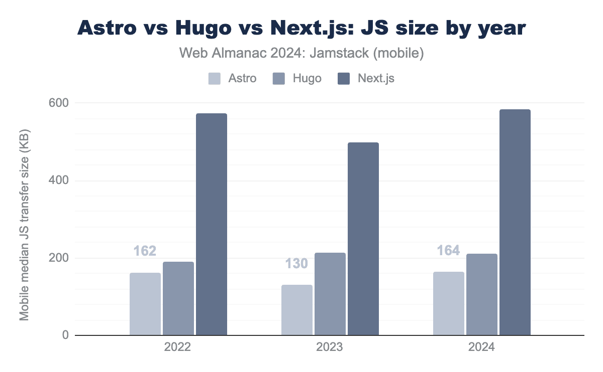 Figure 14.16. Astro vs Hugo vs Next.js: JavaScript size by year.