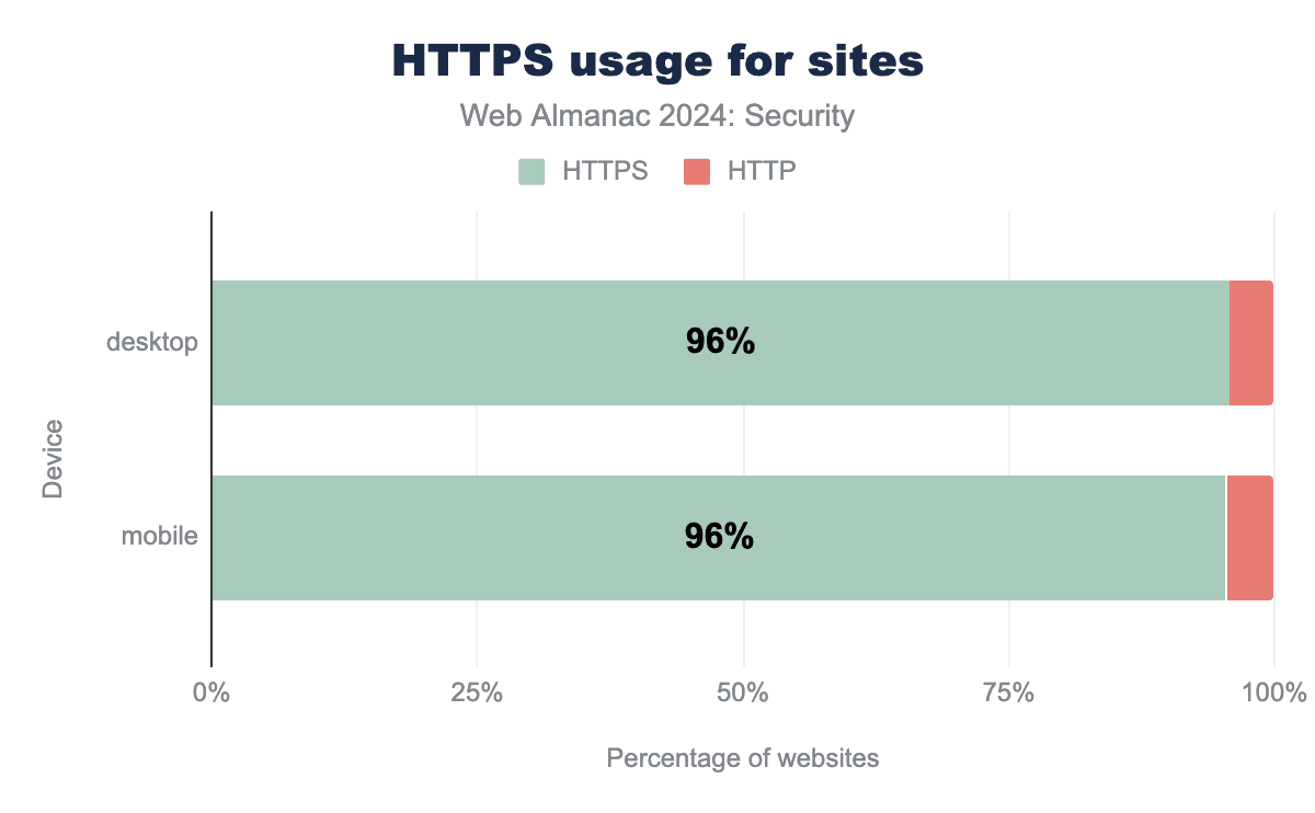 The number of requests served using TLS climbed another 4% to 98% on mobile since the last Almanac in 2022.
