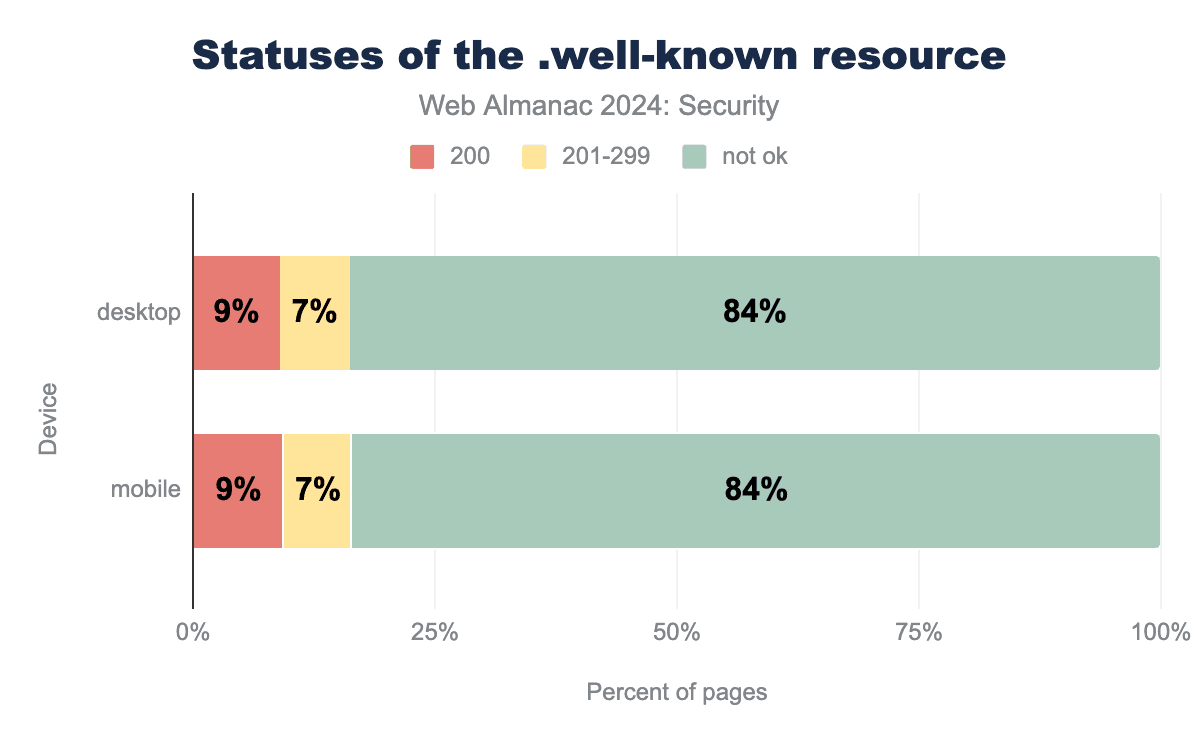 The adoption remains very low. At 0.27% for both mobile and desktop sites it slightly decreased for desktop sites from 0.28% in 2022. Due to the slow standardization process it is not unexpected that the adoption does not change much. We also repeat that websites without authentication mechanisms have no use for this url, which means it would be useless for them to implement it.