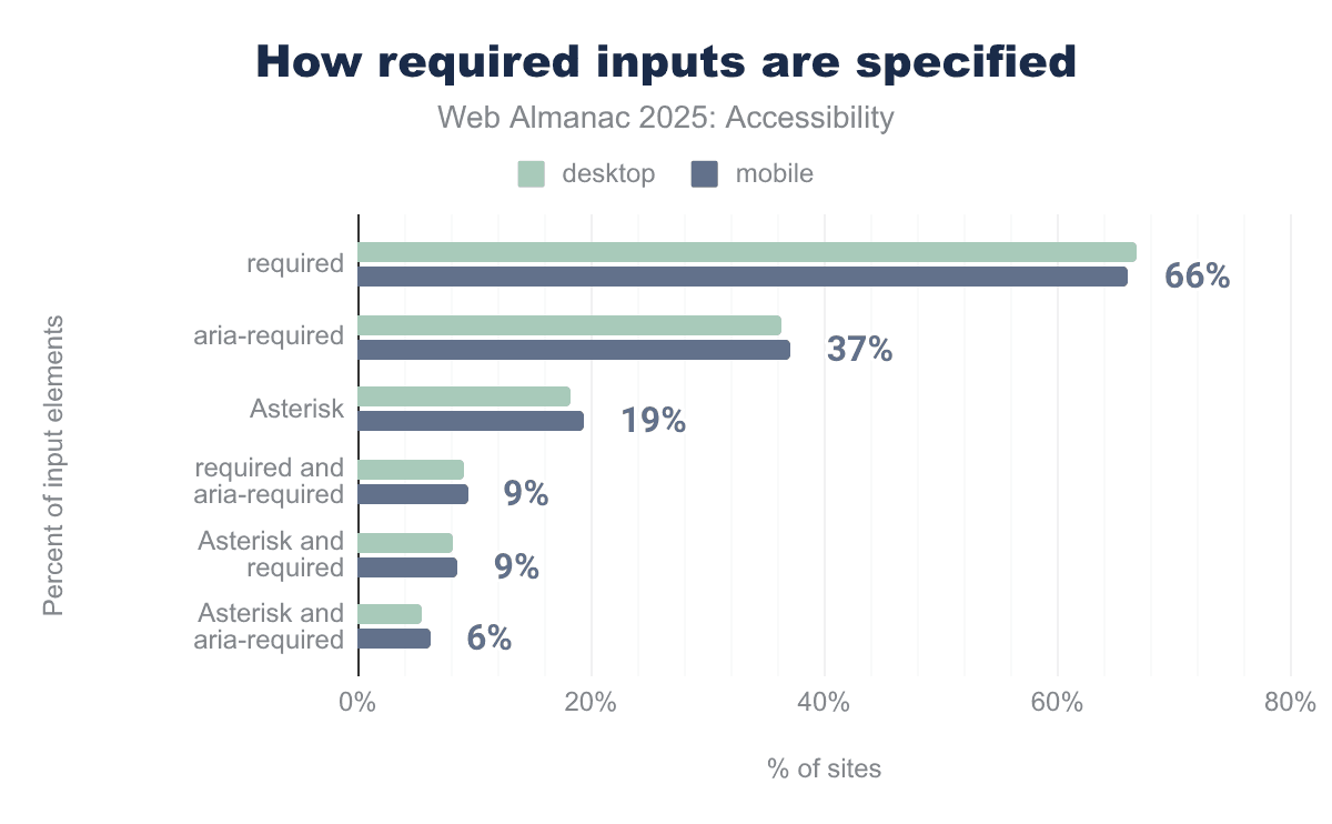 This year, text contrast pass rate improved by roughly 1% compared to 2024. But only 31% of mobile sites currently meet minimum color contrast requirements. Since mobile experiences depend heavily on clear visibility, this gap is a real problem for users accessing the web on their phones.